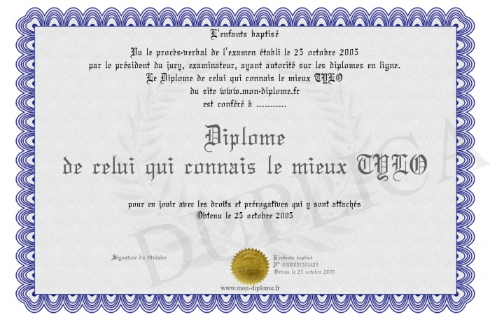 Envoyez par email votre Diplôme de celui qui connais le mieux TYLO personalisé