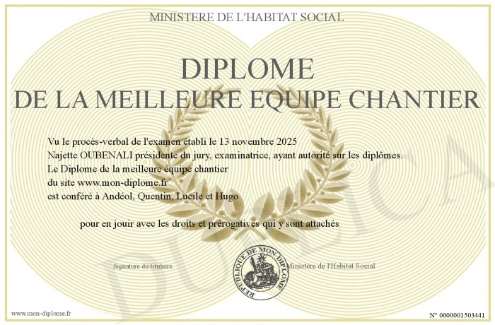 Envoyez par email votre Diplôme de la meilleure équipe chantier personalisé