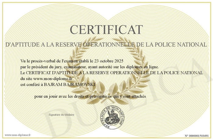 Envoyez par email votre CERTIFICAT D'APTITUDE A LA RESERVE OPERATIONNELLE DE LA POLICE NATIONAL personalisé
