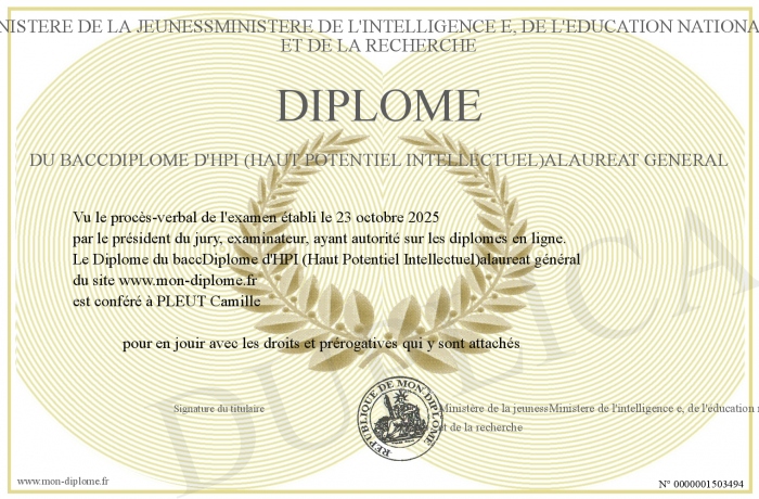 Envoyez par email votre Diplôme du baccDiplome d'HPI (Haut Potentiel Intellectuel)alaureat général personalisé