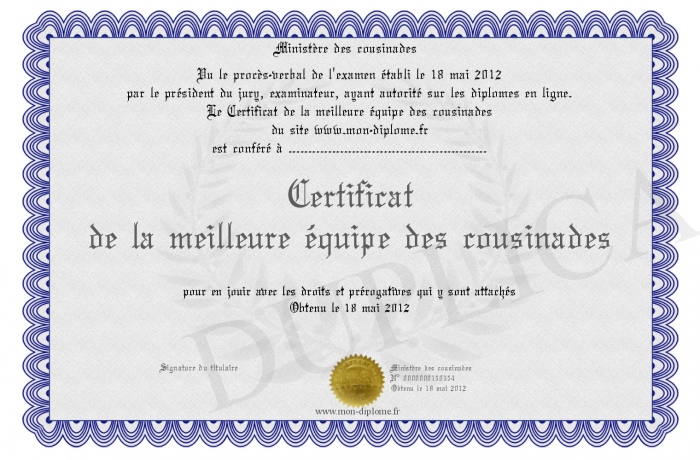 Envoyez par email votre Certificat de la meilleure équipe des cousinades personalisé