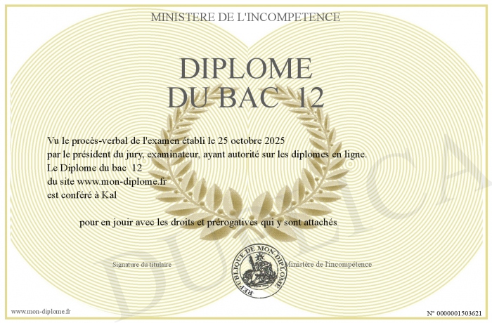 Envoyez par email votre Diplôme du bac 12 personalisé