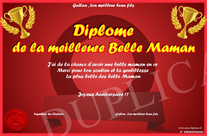 Envoyez par email votre Diplôme de la meilleure Belle Maman personalisé