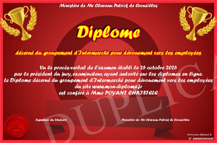 Envoyez par email votre Diplome décerné du groupement d'Intermarché pour dévouement vers les employées personalisé