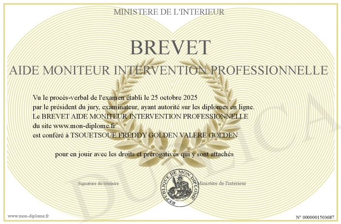 Envoyez par email votre BREVET AIDE MONITEUR INTERVENTION PROFESSIONNELLE personalisé