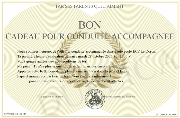 Envoyez par email votre Bon cadeau pour conduite accompagnée personalisé