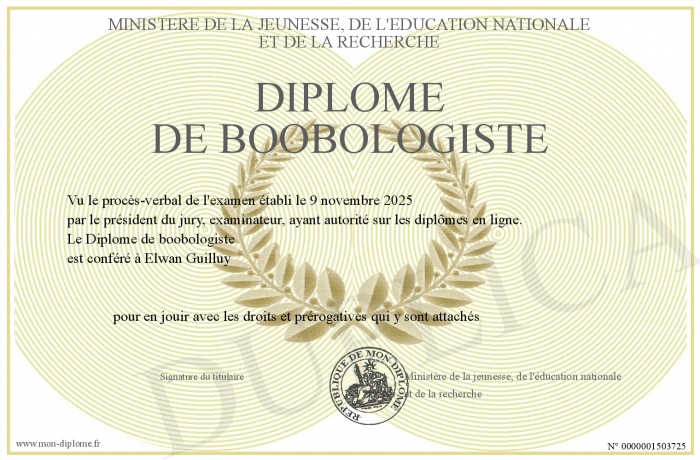 Envoyez par email votre Diplôme de boobologiste personalisé