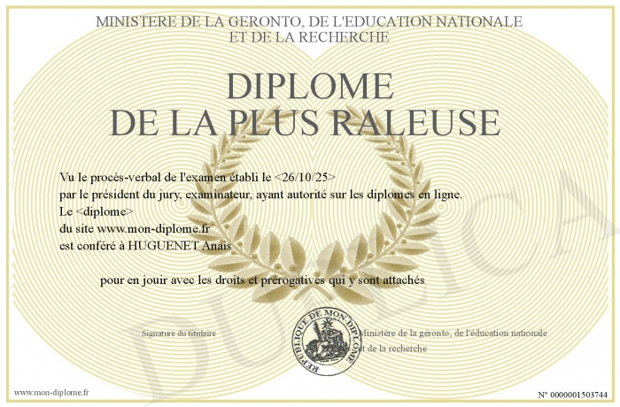 Envoyez par email votre Diplôme de la plus raleuse personalisé