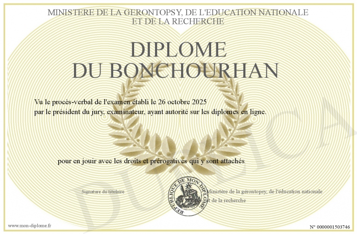Envoyez par email votre Diplôme du BONCHOURHAN personalisé