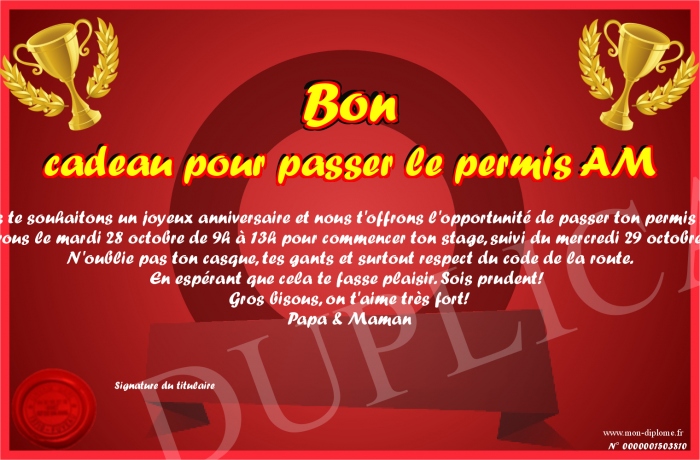 Envoyez par email votre Bon cadeau pour passer le permis AM personalisé