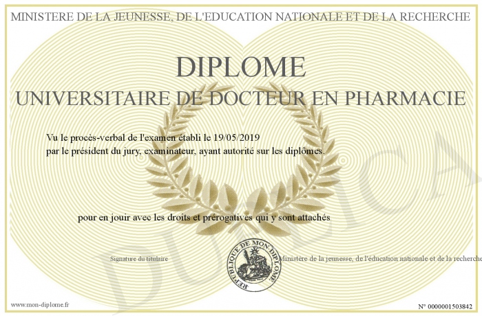 Envoyez par email votre Diplôme universitaire de docteur en pharmacie personalisé