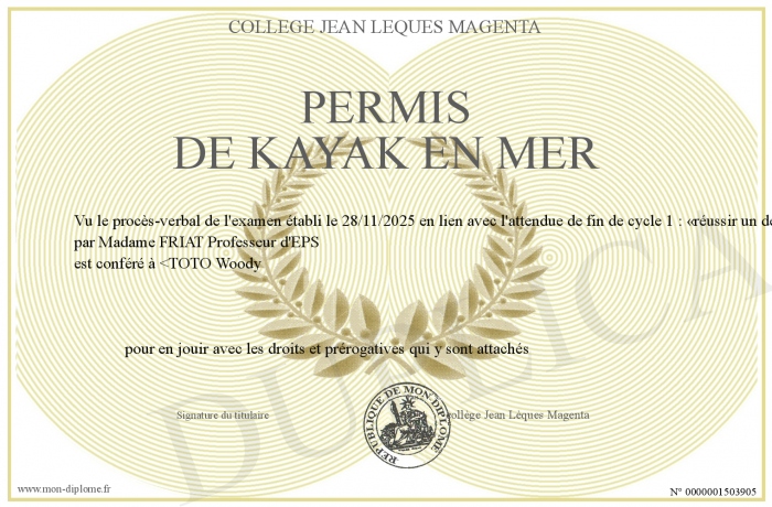 Envoyez par email votre Permis de kayak en mer personalisé