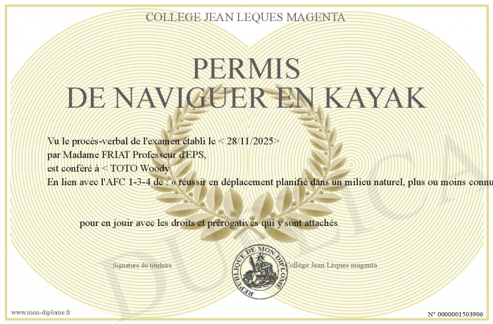 Envoyez par email votre Permis de naviguer en kayak personalisé