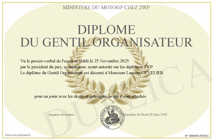 Envoyez par email votre Diplôme du Gentil Organisateur personalisé