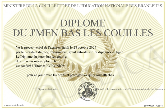 Envoyez par email votre Diplôme du j'men bas les couilles personalisé