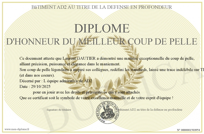 Envoyez par email votre Diplôme d'honneur du meilleur coup de pelle personalisé