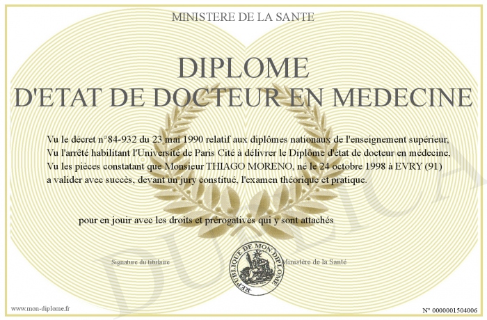 Envoyez par email votre Diplôme d'état de Docteur en Médecine personalisé