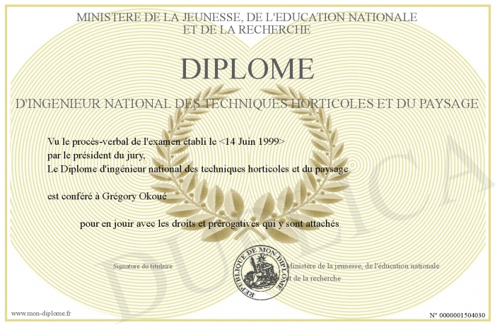 Envoyez par email votre Diplôme d'ingénieur national des techniques horticoles et du paysage personalisé
