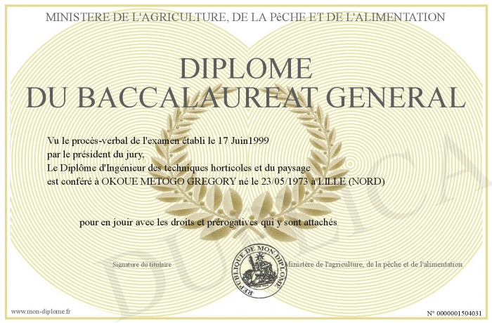 Envoyez par email votre Diplôme du baccalaureat général personalisé