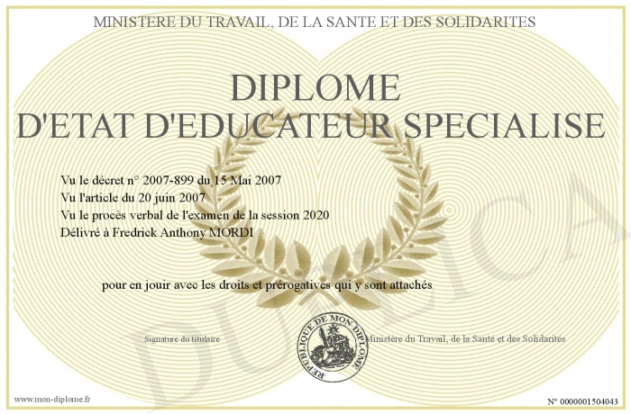 Envoyez par email votre DIPLOME D'ETAT D'EDUCATEUR SPECIALISE personalisé