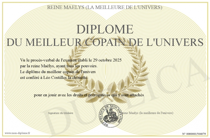 Envoyez par email votre Diplôme du meilleur copain de l'univers personalisé