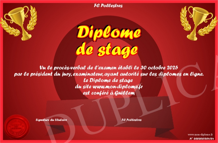 Envoyez par email votre Diplôme de stage personalisé