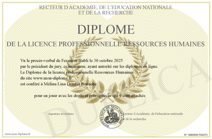 Envoyez par email votre Diplôme de la licence professionnelle Ressources Humaines personalisé