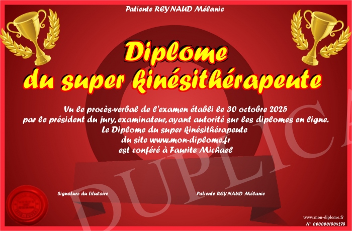 Envoyez par email votre Diplôme du super kinésithérapeute personalisé