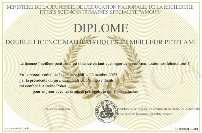 Envoyez par email votre Diplôme double licence mathématiques et meilleur petit ami personalisé