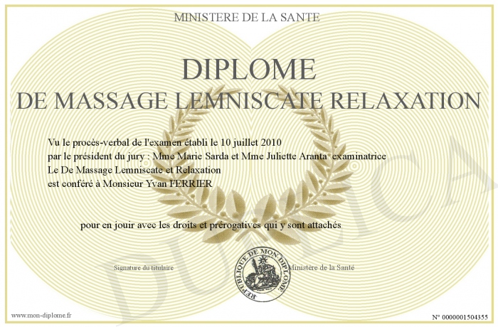 Envoyez par email votre Diplôme de Massage Lemniscate Relaxation personalisé