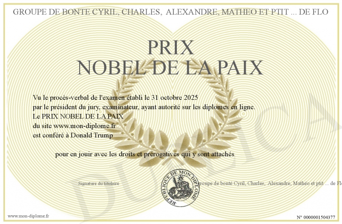 Envoyez par email votre PRIX NOBEL DE LA PAIX personalisé