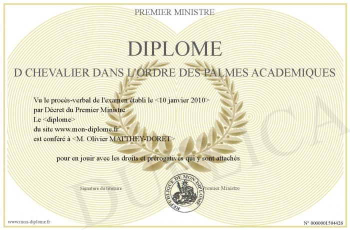 Envoyez par email votre Diplôme d Chevalier dans l'Ordre des Palmes académiques personalisé