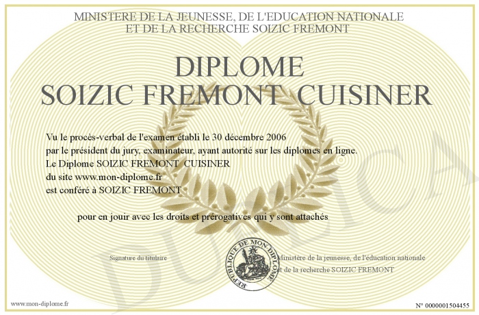 Envoyez par email votre Diplôme SOIZIC FREMONT CUISINER personalisé