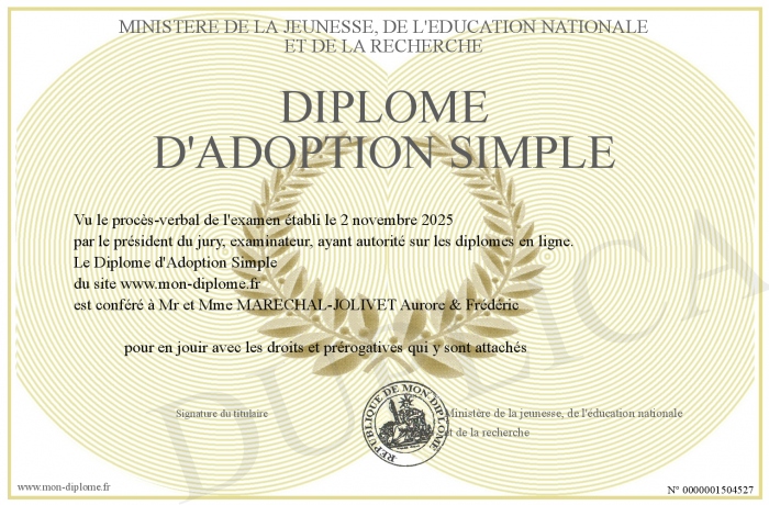 Envoyez par email votre Diplôme d'Adoption Simple personalisé