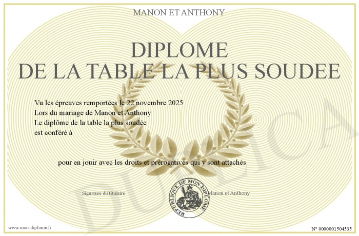 Envoyez par email votre Diplôme de la table la plus soudée personalisé