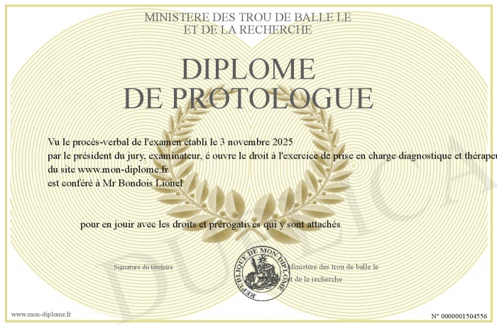 Envoyez par email votre Diplôme de Protologue personalisé