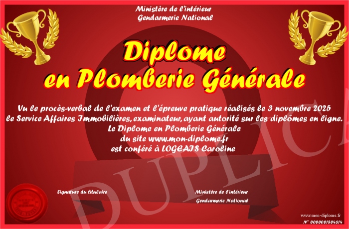 Envoyez par email votre Diplôme en Plomberie Générale personalisé