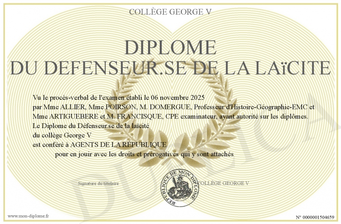 Envoyez par email votre Diplôme du Défenseur.se de la laïcité personalisé