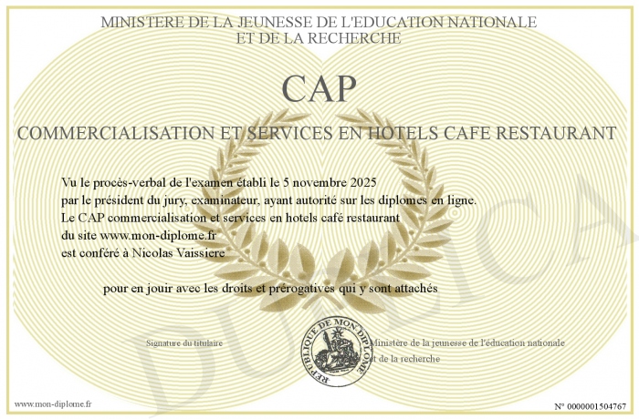 Envoyez par email votre CAP commercialisation et services en hôtels café restaurant personalisé