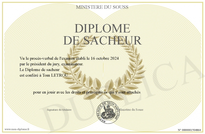 Envoyez par email votre Diplôme de sacheur personalisé