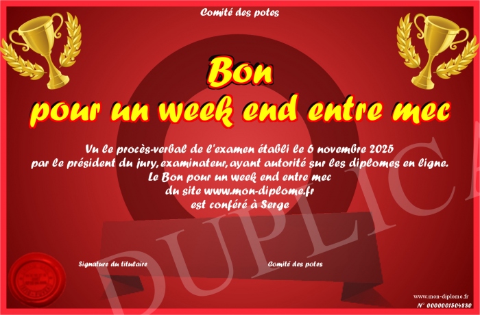 Envoyez par email votre Bon pour un week end entre mec personalisé