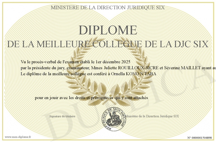 Envoyez par email votre Diplôme de la Meilleure Collègue de la DJC SIX personalisé