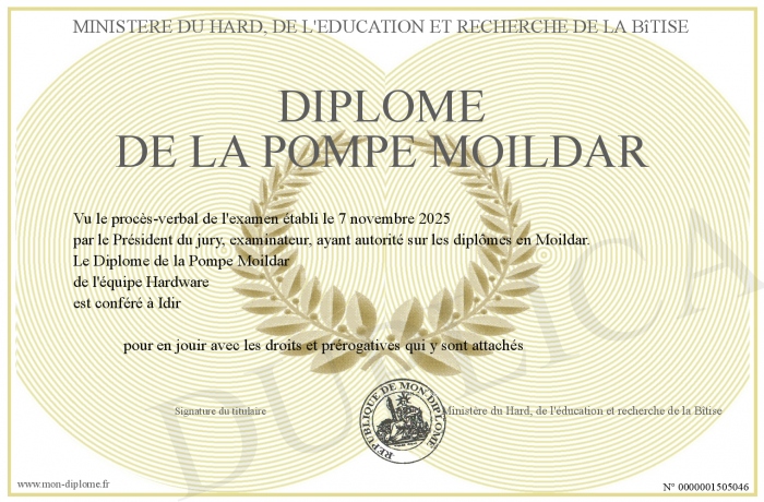Envoyez par email votre Diplôme de la Pompe Moildar personalisé