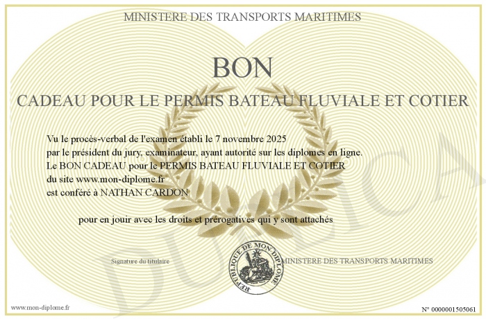 Envoyez par email votre BON CADEAU pour le PERMIS BATEAU FLUVIALE ET COTIER personalisé