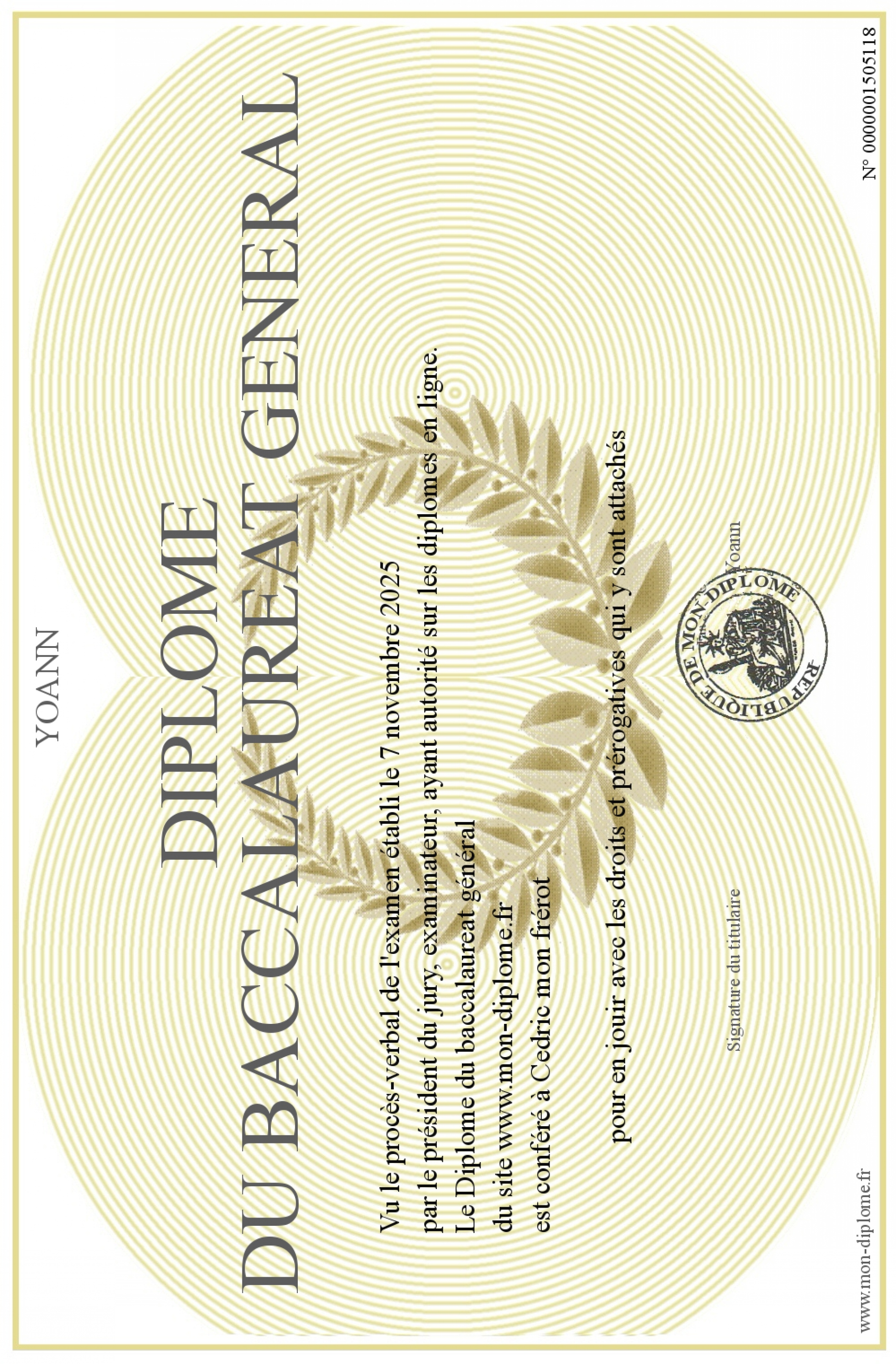 Envoyez par email votre Diplôme du baccalaureat général personalisé