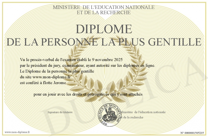 Envoyez par email votre Diplôme de la personne la plus gentille personalisé