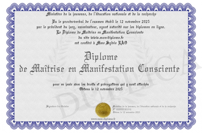 Envoyez par email votre Diplôme de Maîtrise en Manifestation Consciente personalisé