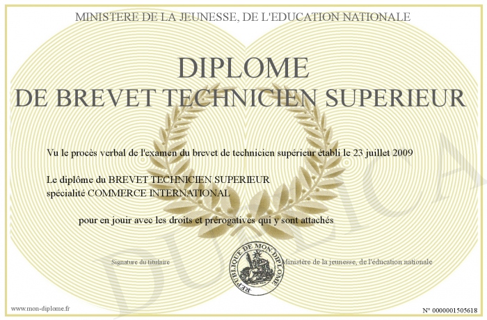 Envoyez par email votre Diplôme de brevet technicien supérieur personalisé