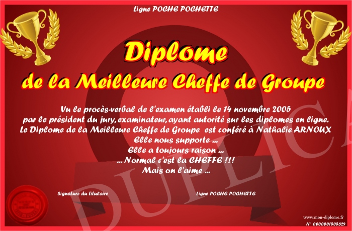 Envoyez par email votre Diplôme de la Meilleure Cheffe de Groupe personalisé