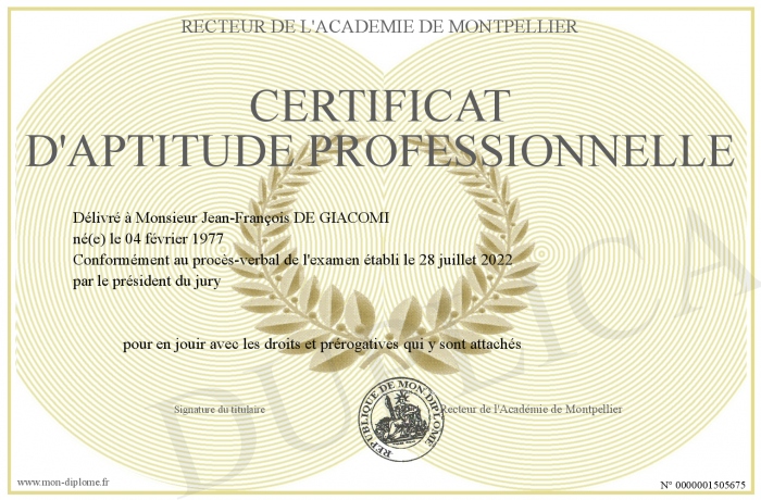 Envoyez par email votre CERTIFICAT D'APTITUDE PROFESSIONNELLE personalisé